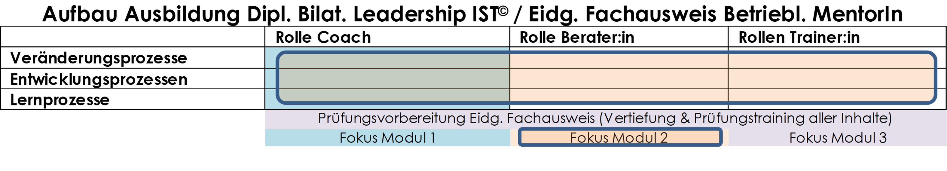 In der zweiten Etappe liegt der Kompetenzaufbau nebst Coaching auch auf den beiden Rollen Trainer:in und Berater:in. Dieses Modul wird mit einer Prüfung zu Mentor:in IST© abgeschlossen.