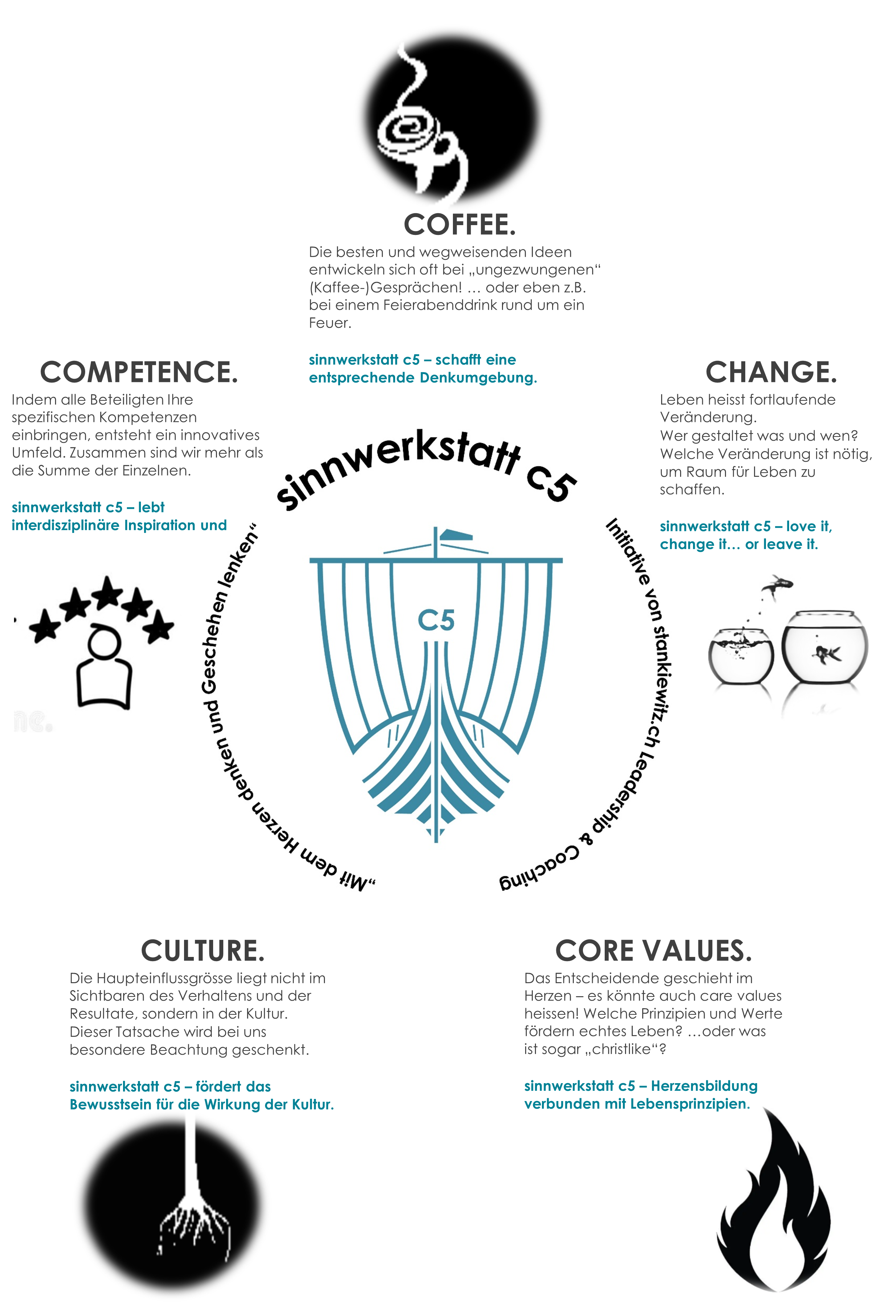Die Sinnwerkstatt c5 steht für ein gemeinsames und interdisziplinäres Herantasten an die Erfassung komplexer Herausforderungen und Erarbeitung entsprechender Lösungsansätze in ungezwungener Atmosphäre. Im Dialog unterschiedlicher Menschen rund ums offene Feuer entstehen so überraschende und spannende Erkenntnisse und Lösungsansätze. Die Teilnahme ist offeriert.